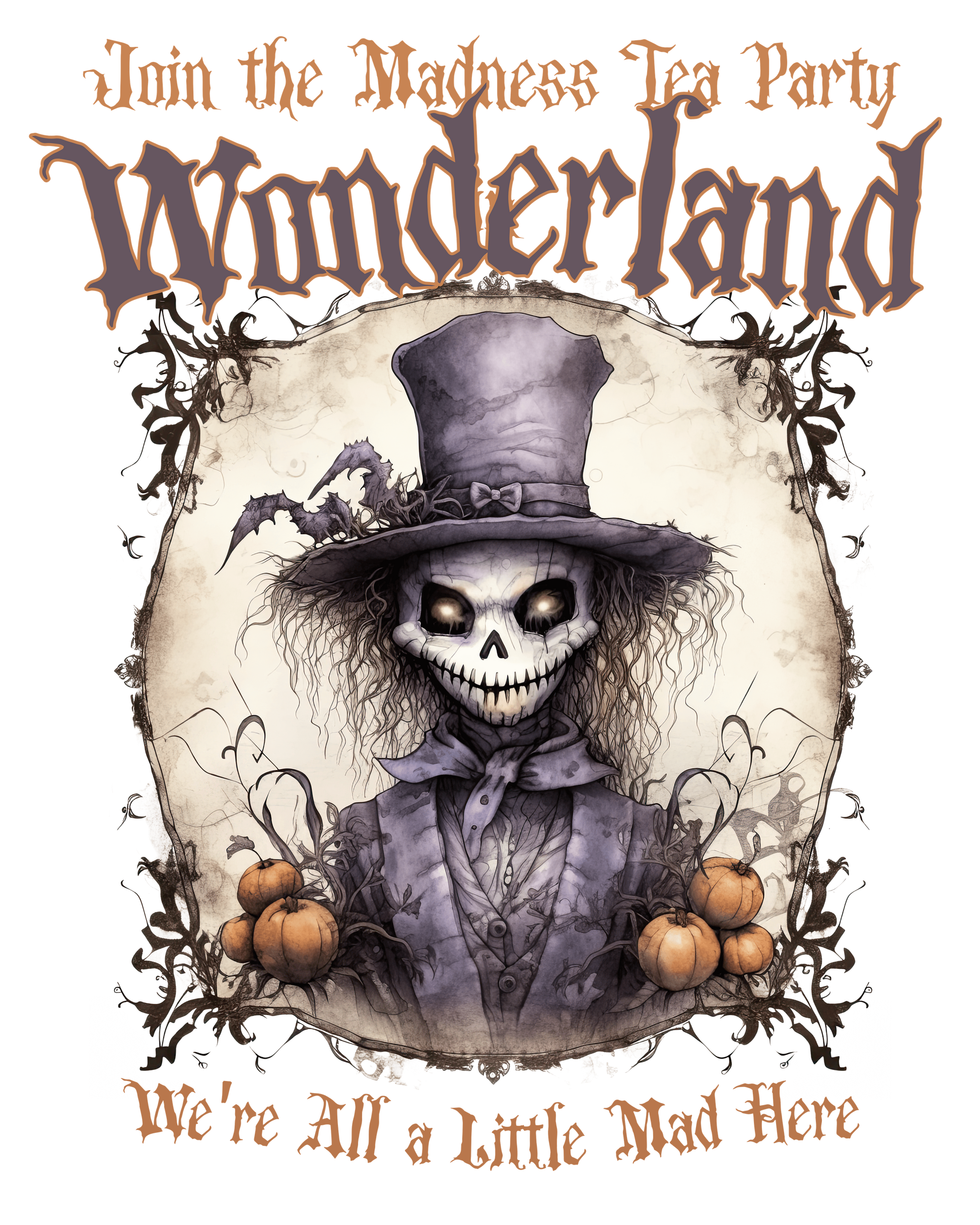 Embrace the spooky spirit with a dash of madness and lots of festive fun. Whether you're trick-or-treating or hosting your own wonderland gathering, this tee captures the playful essence of Halloween season.